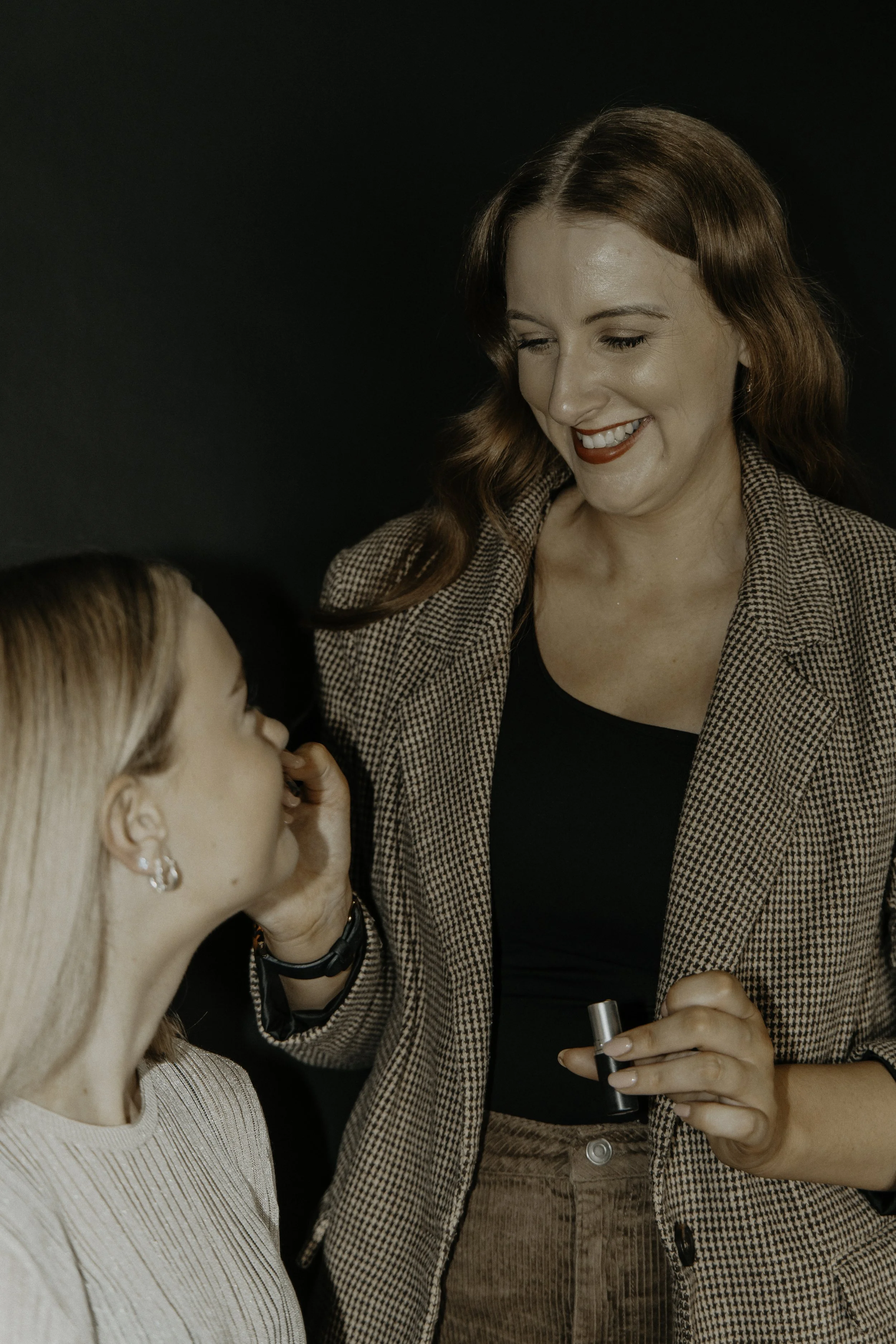 A young woman with long wavy brown hair, wearing a brown uniform, sitting on a beige chair, smiling at the camera.